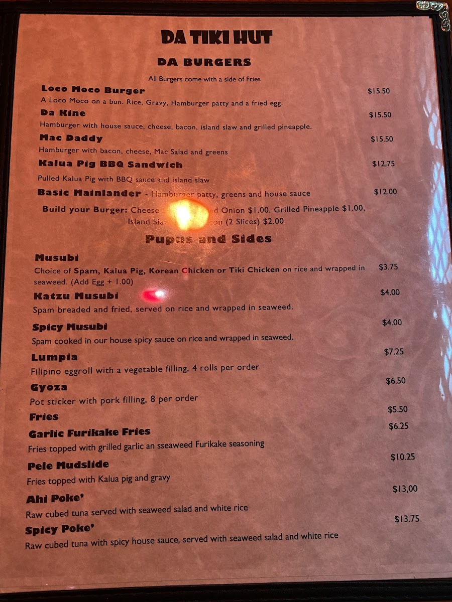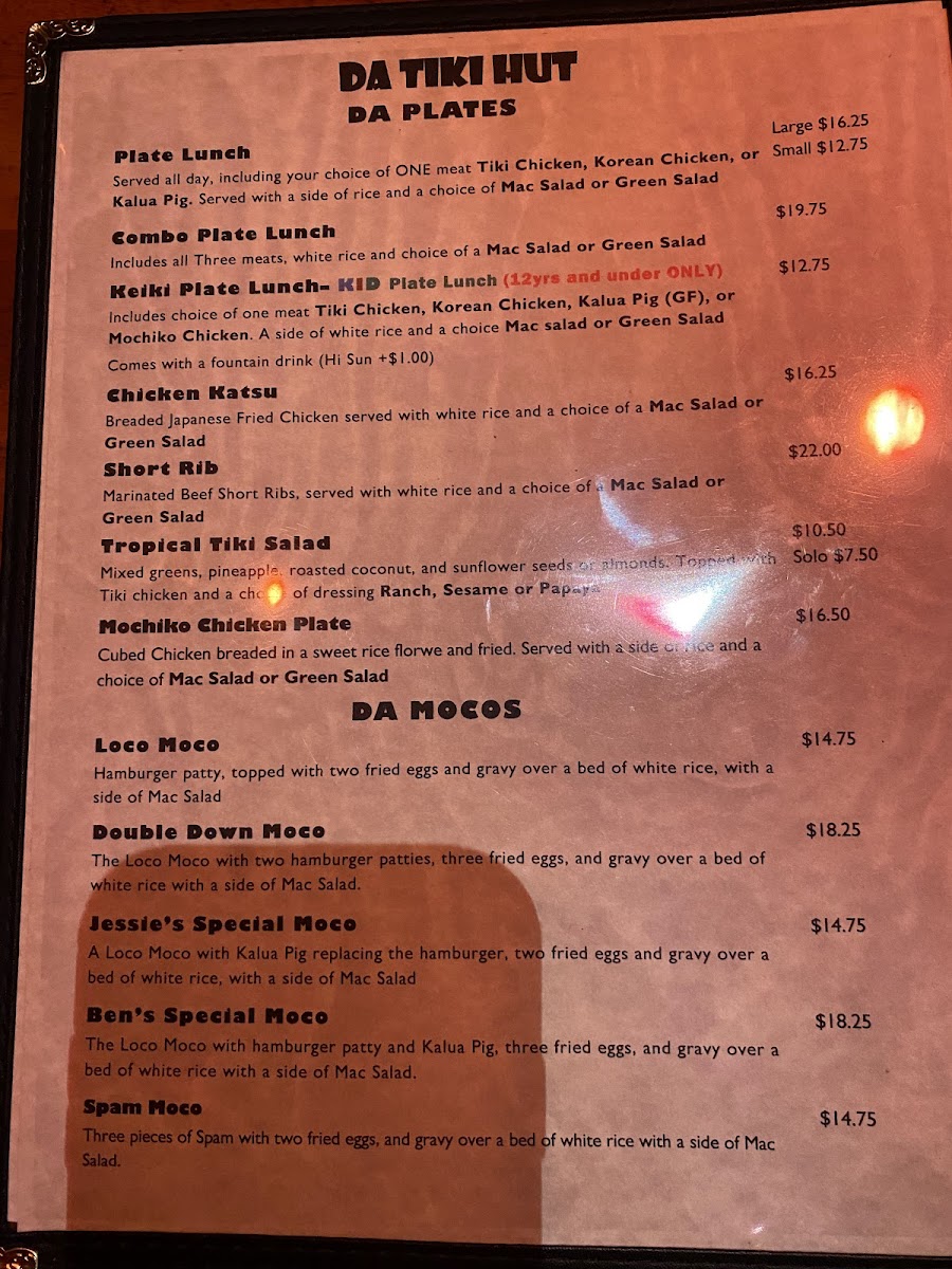 Choice of Spam, Kalua Pig, Korean Chicken or Tiki Chicken.
